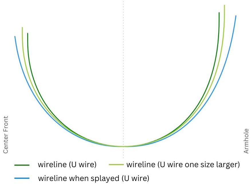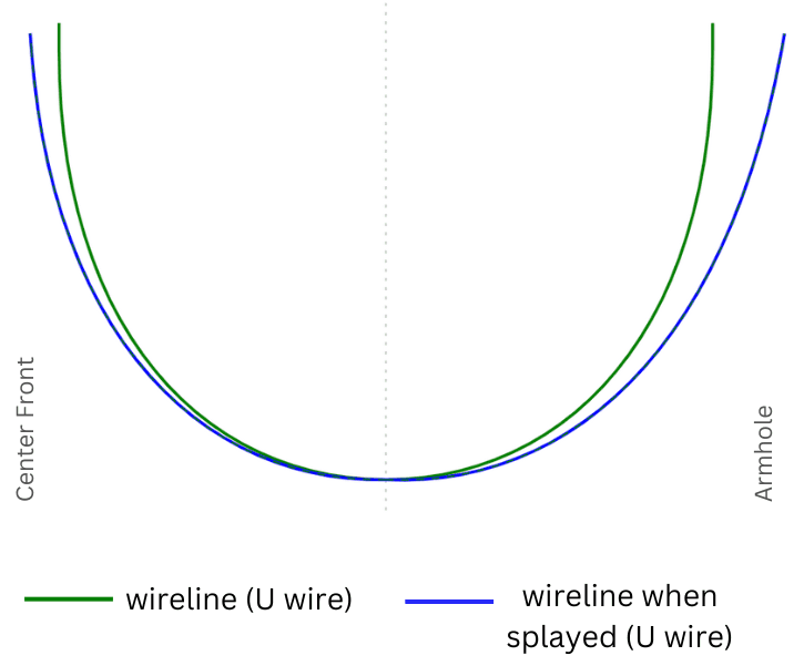 Shorter wire styles typically have built-in splay, though this isn’t exclusive to them. Because shorter wires naturally splay less due to their length, some amount of splay is built-in to help compensate for lack of splay. This is especially true for shorter wires at the center front, where built-in splay on centerfront side helps ensure that the wire does not poke the breast tissue. Longer wire styles typically have minimal to no built in splay.