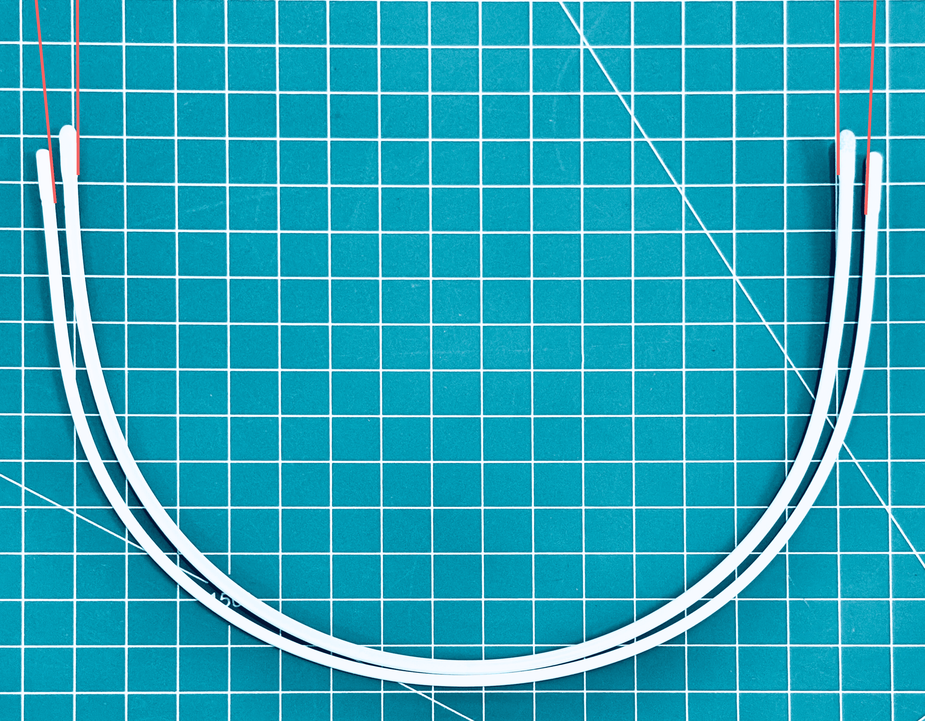 The RTW wire is a classic U wire with zero built-in splay, while the BMS Super Long has built-in splay. If you look closely at the image, you’ll see red lines (tangents) drawn at the wire ends. For the RTW wire, the lines are parallel and point straight up. In contrast, the BMS Super Long lines are slightly angled outward, indicating built-in splay.